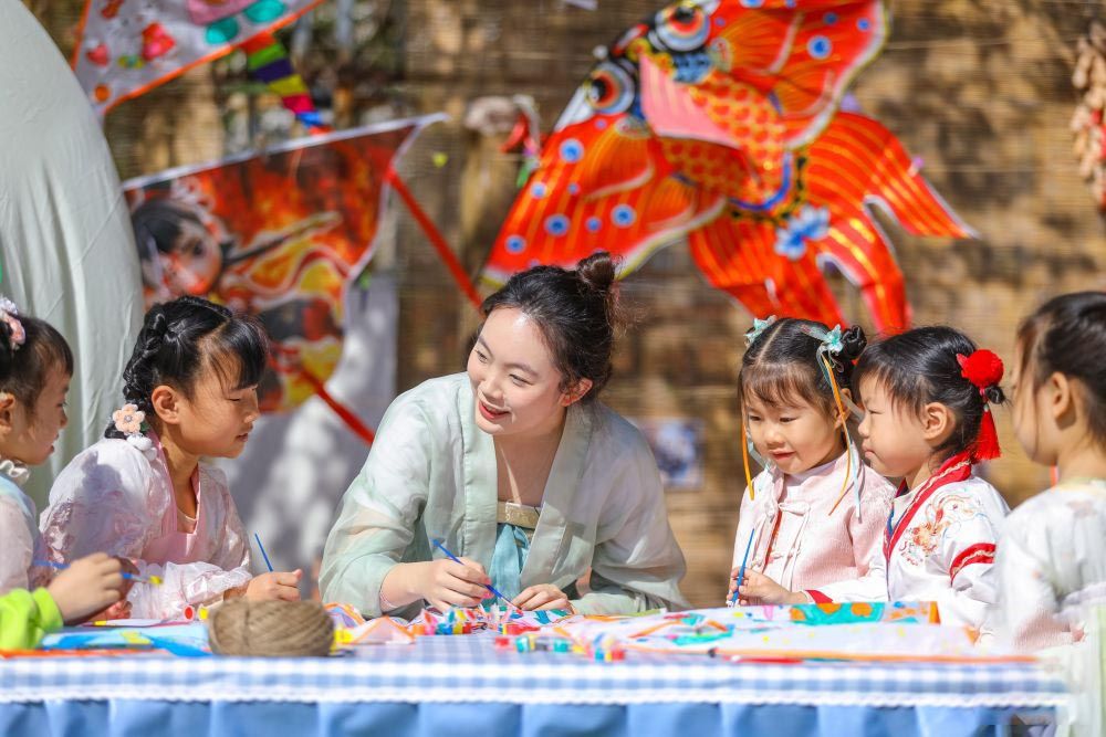 4月2日,在山东青岛李沧区青峰路幼儿园开展的迎清明活动中,老师指导小朋友绘制纸鸢。