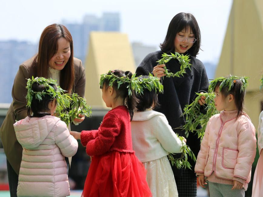 4月3日,四川乐山瑞锦幼儿园小朋友和老师一起制作柳帽。