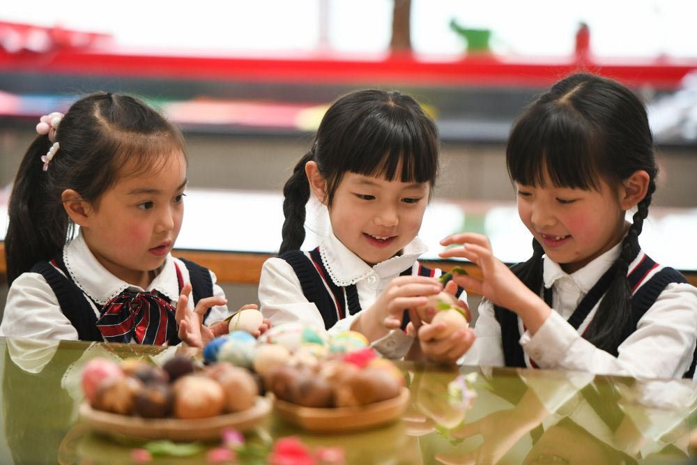 4月3日,在浙江金华婺城小学,小学生在制作清明花草蛋。