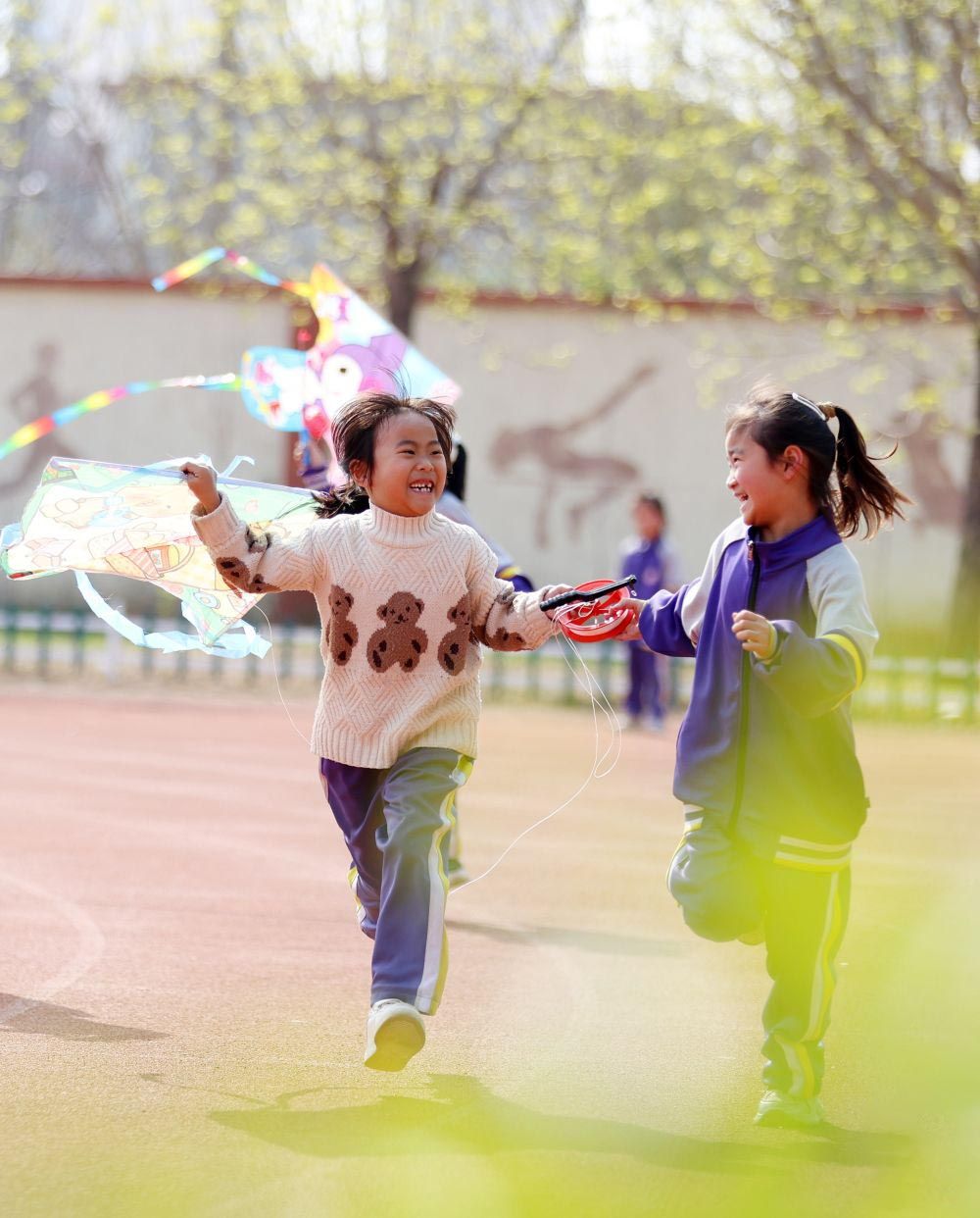 4月3日,山东临沂郯城县第一实验小学学生在操场上放风筝。