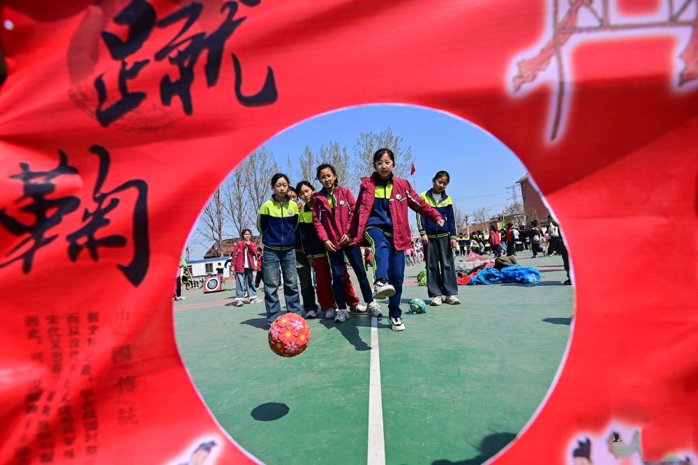 4月3日,山东青州苏埠屯学校学生体验蹴鞠。