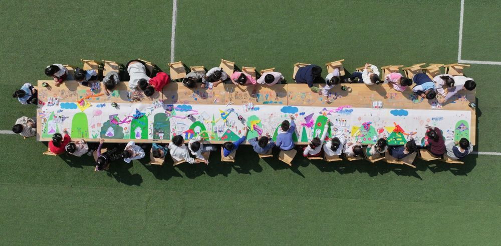 4月3日,山东邹平高新街道中心幼儿园的小朋友在绘制清明长卷。