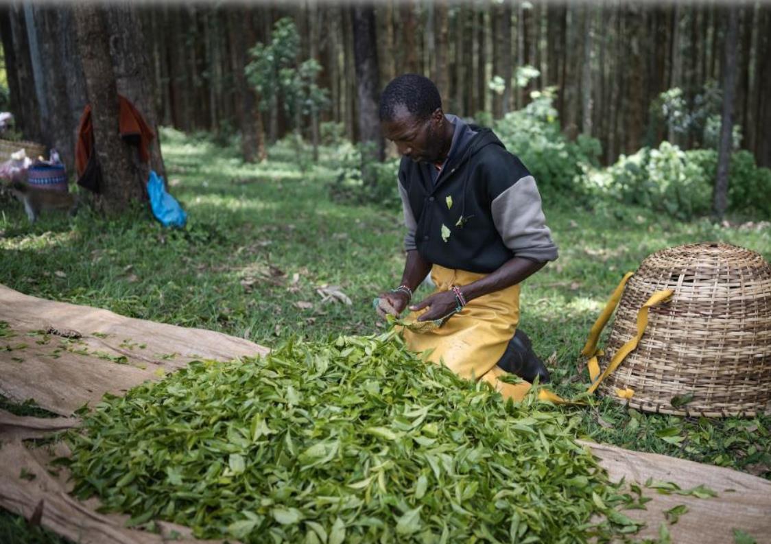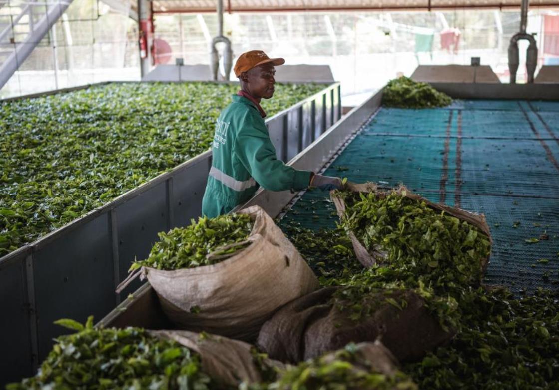 凯里乔位于肯尼亚西部裂谷省,是重要的茶叶产地,茶产量约占肯尼亚全国的1/4,被称为肯尼亚“茶都”。图为4月4日,工人在肯尼亚凯里乔的一处茶厂搬运茶叶。