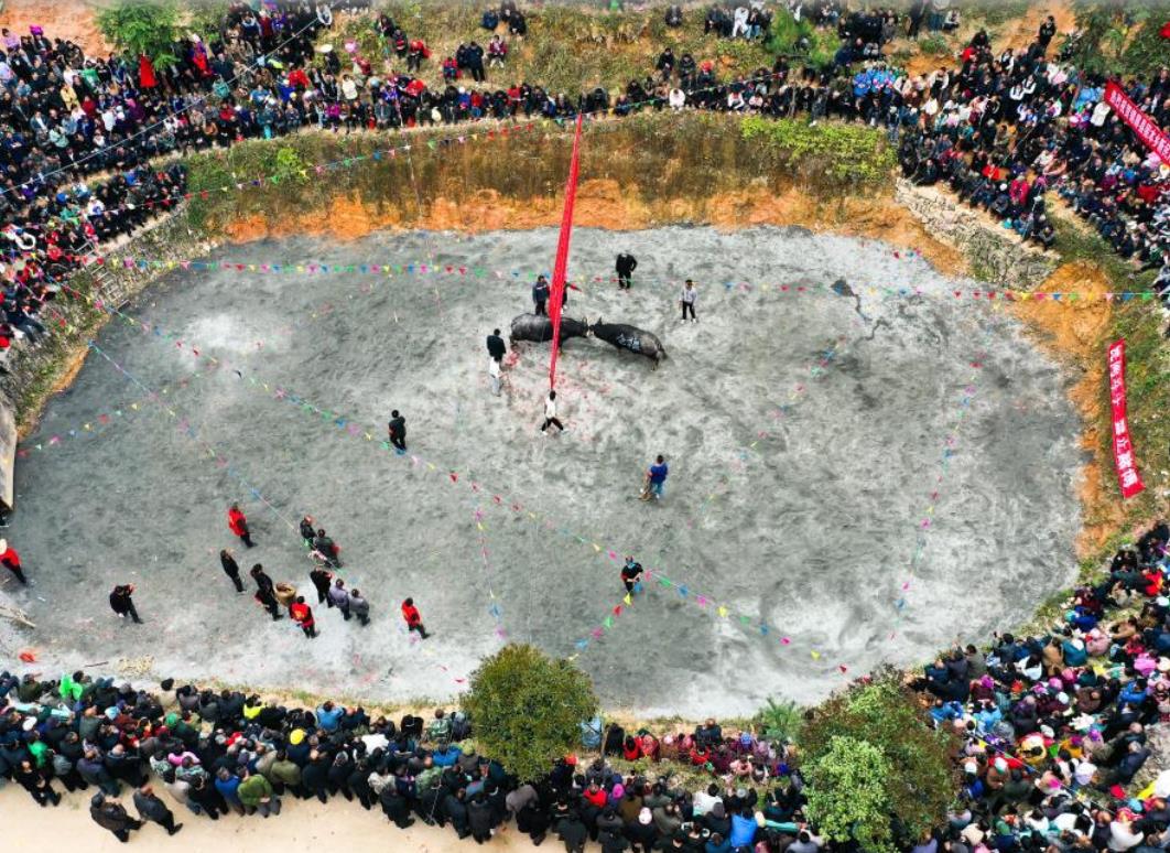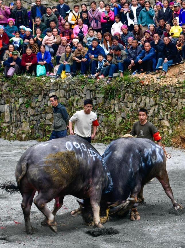 4月6日,人们在贵州锦屏县固本乡东庄村观看民间斗牛。