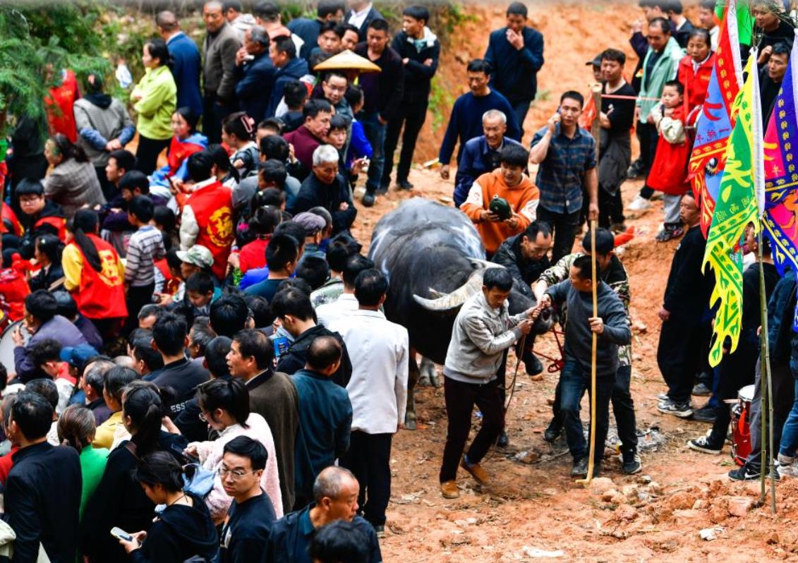 4月6日,人们观看斗牛游塘仪式。