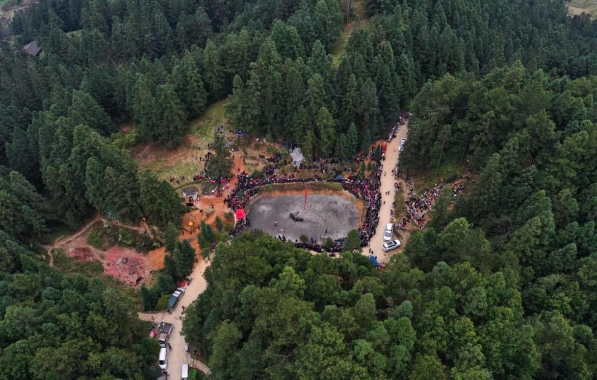 4月6日,贵州黔东南苗族侗族自治州锦屏县固本乡举办2025年新民片区三月初九牯藏节斗牛民俗活动,来自各苗乡侗寨的人们齐聚斗牛塘,斗牛欢庆牯藏节。图为航拍牯藏节斗牛民俗活动现场。