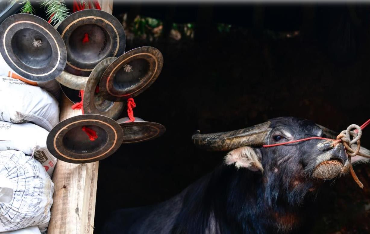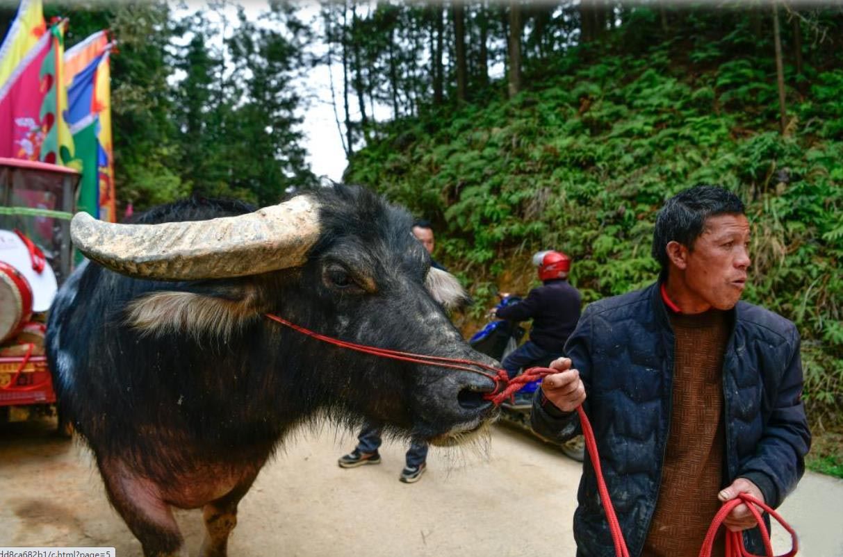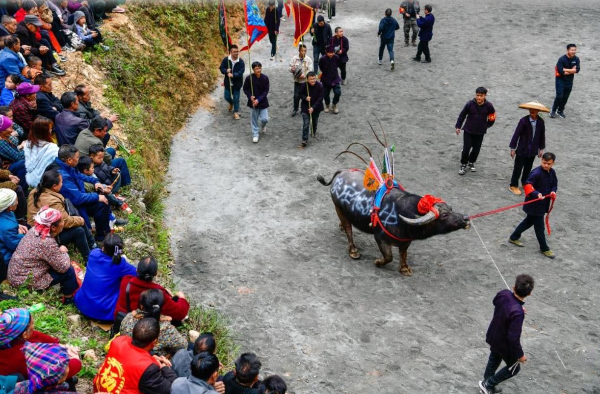 4月6日,在贵州锦屏县固本乡东庄村,参加斗牛活动的水牯牛准备入场。