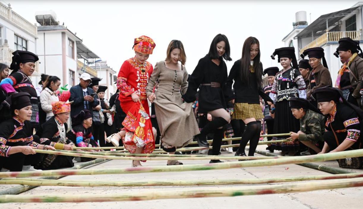4月5日,游客在云南文山马塘镇十里桥村体验竹竿舞。新华社