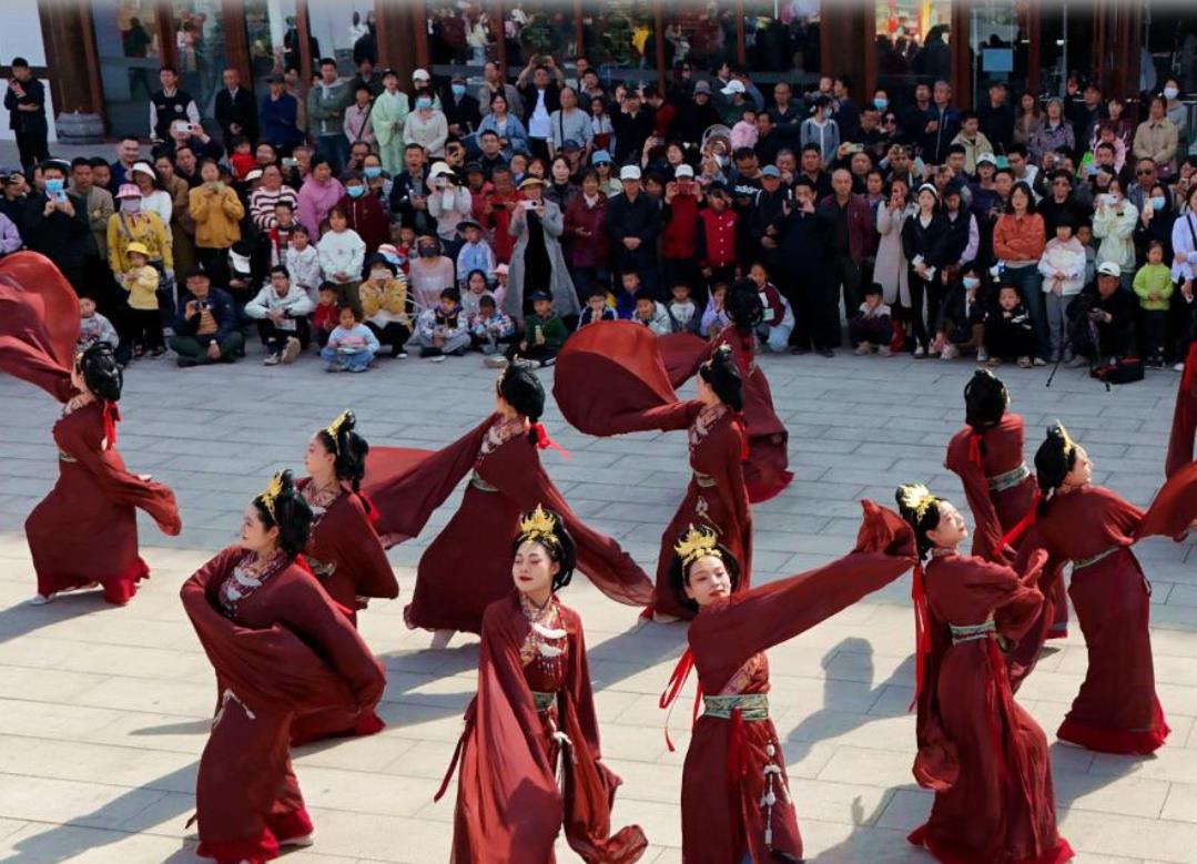 4月5日,在河南南阳卧龙岗文化园,游客在观赏传统民俗文化表演。新华社