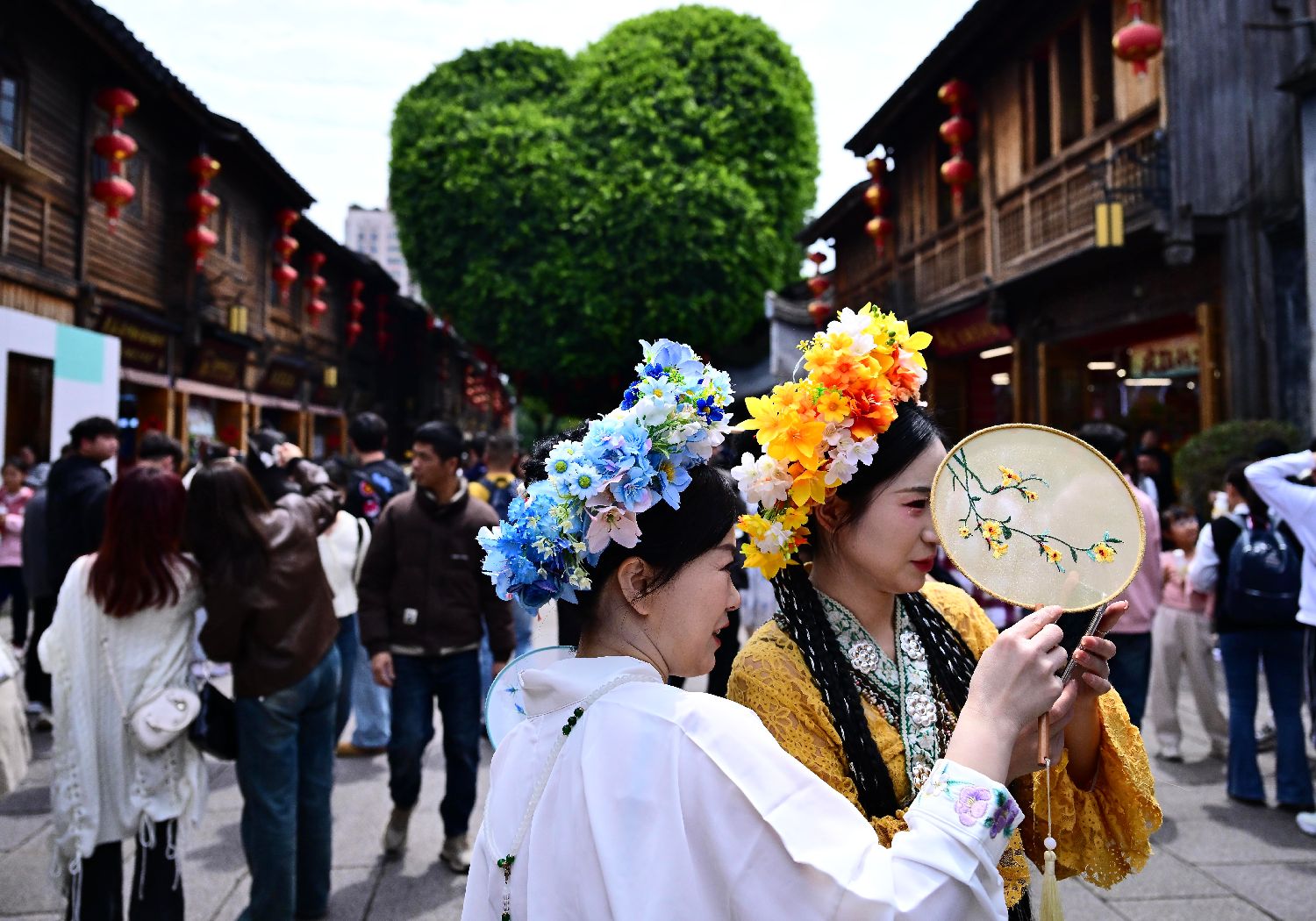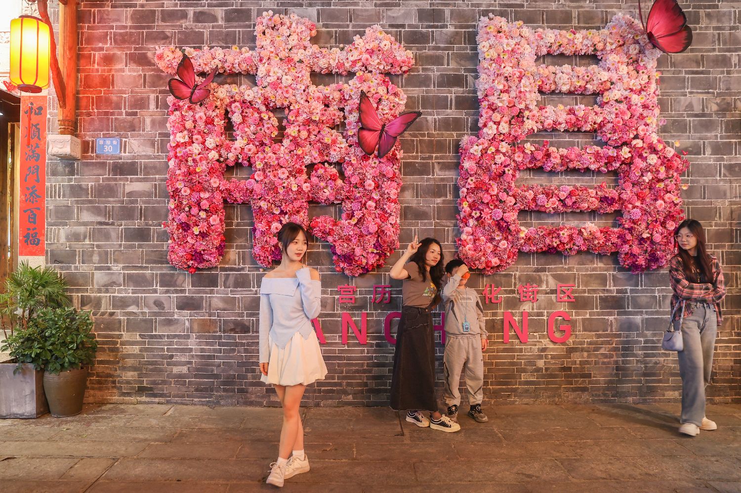 4月5日,江西南昌万寿宫历史文化街区,游客在由花朵组成的“南昌”二字前拍照“打卡”。中新社
