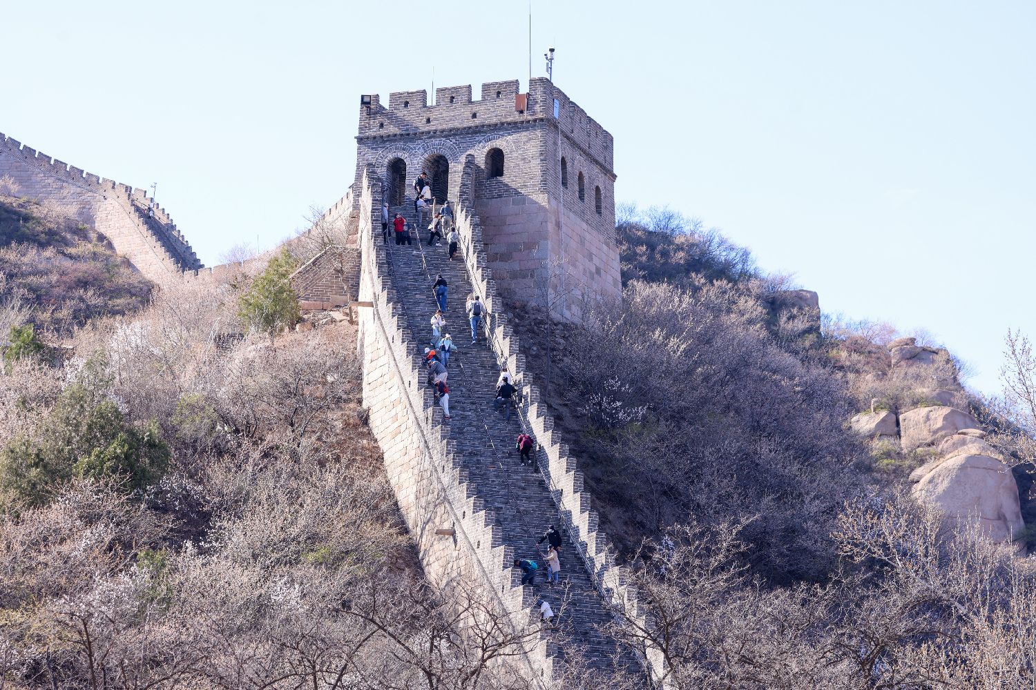 4月5日,游客在北京市延庆区游览水关长城。中新社