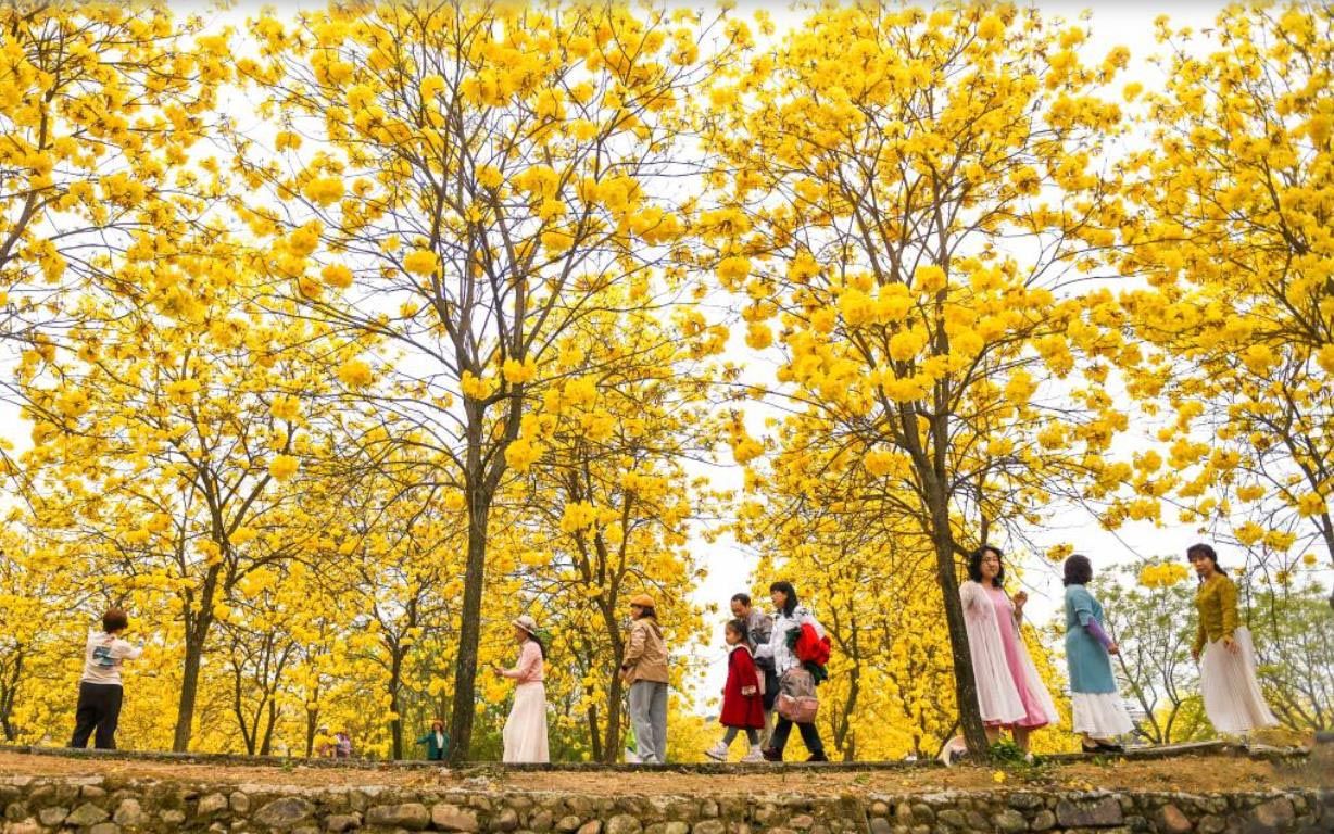 4月5日,在广西桂林临桂区会仙镇岭上村,人们在黄花风铃木树下游玩。新华社