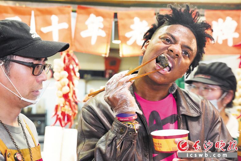 “甲亢哥”品尝长沙臭豆腐。长沙晚报
