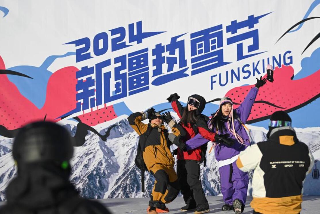 2024年12月4日,游客在新疆阿勒泰禾木吉克普林国际滑雪度假区2024年新疆热雪节活动上合影。