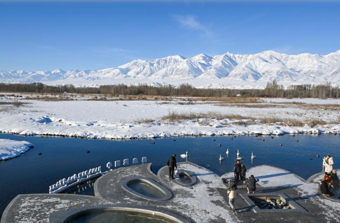 2024年12月22日,游客在新疆温泉国家湿地公园内体验温泉。
