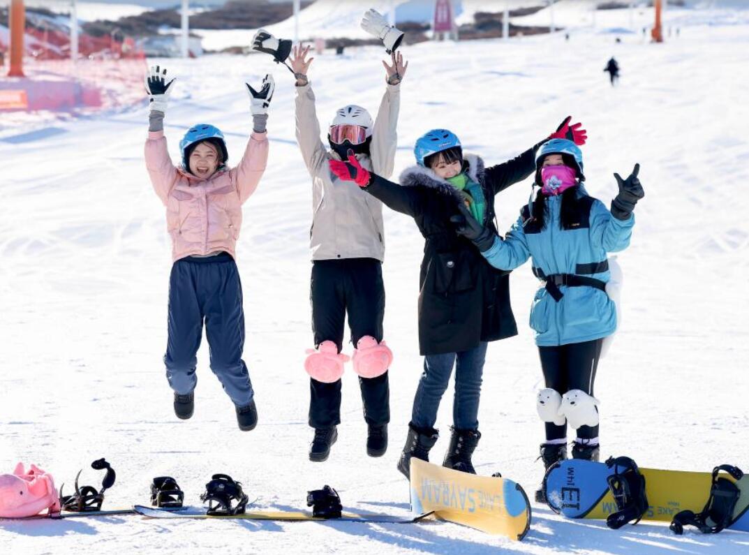 1月27日,几名滑雪爱好者在新疆丝绸之路山地度假区合影留念。