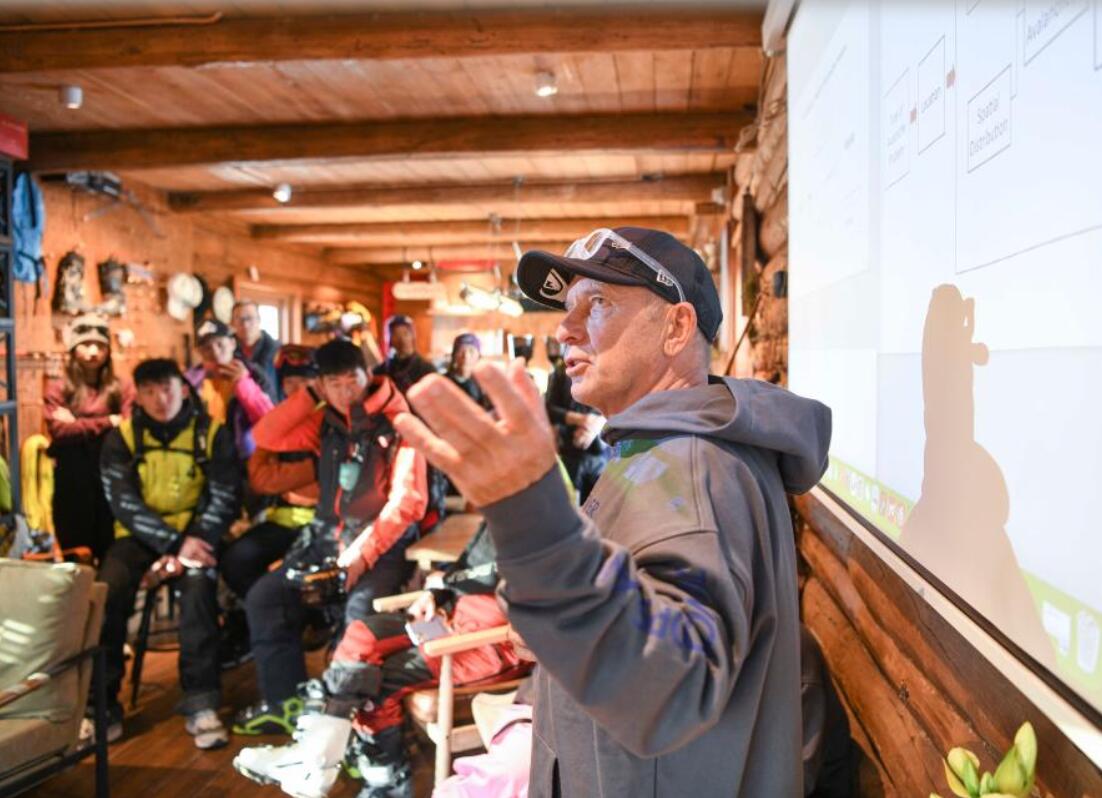 2024年12月3日,一名来自新西兰的滑雪专家在新疆阿勒泰禾木吉克普林国际滑雪度假区向中外雪友讲授滑雪知识。