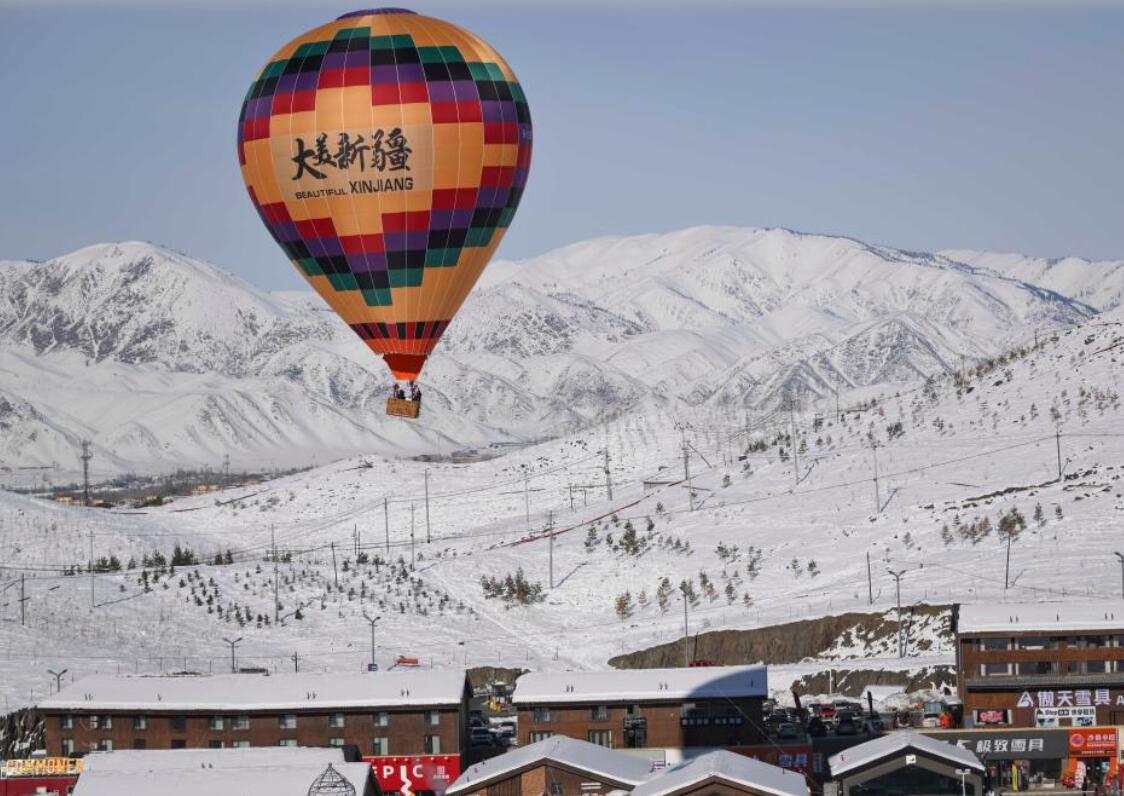 1月25日,游客在新疆阿勒泰将军山国际滑雪度假区乘坐热气球赏雪景。