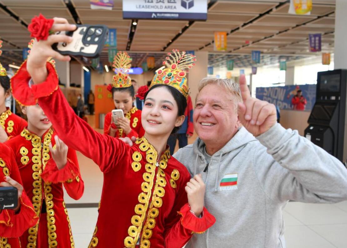 2月23日,在新疆天山天池国际滑雪场雪具大厅,参加2025年中国国际雪地排球邀请赛的保加利亚男队教练员(右)和参与文艺表演的中学生木妮拉·艾买提合影。