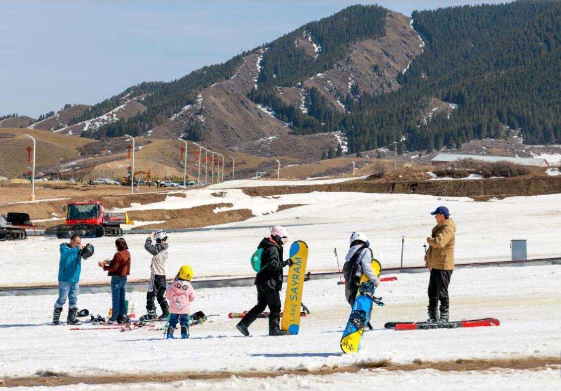 4月5日,游客在新疆丝绸之路山地度假区滑雪。
