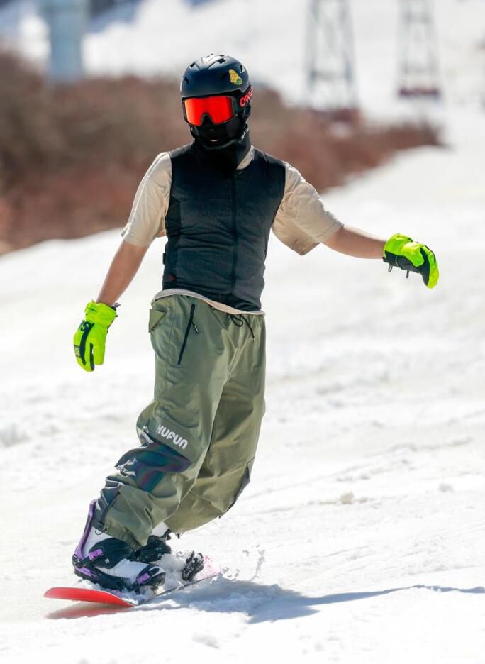 4月5日,一名身着短袖的滑雪爱好者在新疆丝绸之路山地度假区滑雪,当日当地最高气温已达到20℃左右。