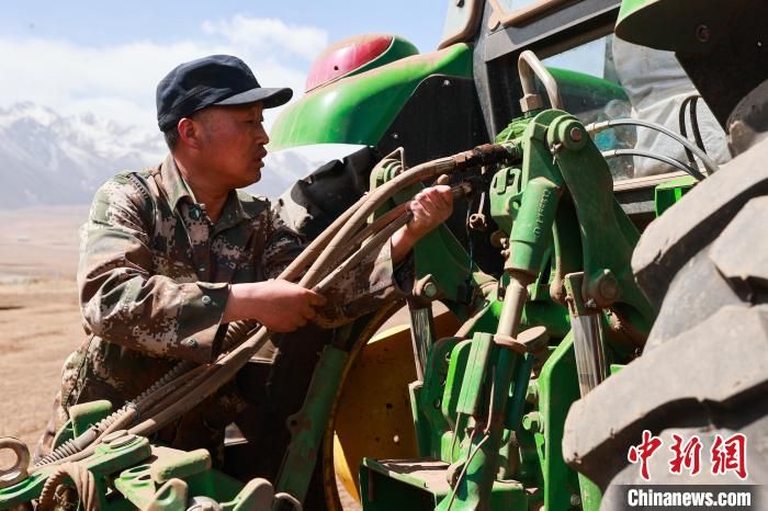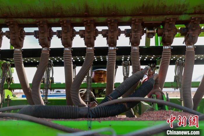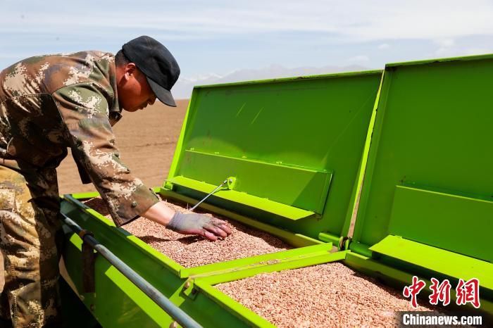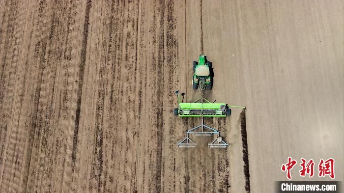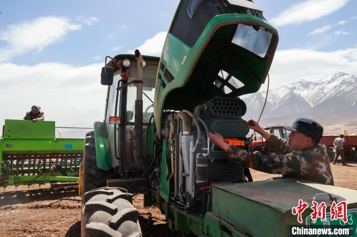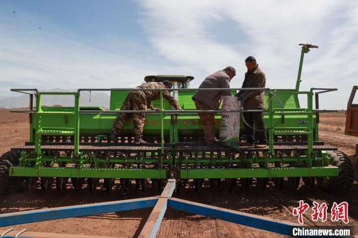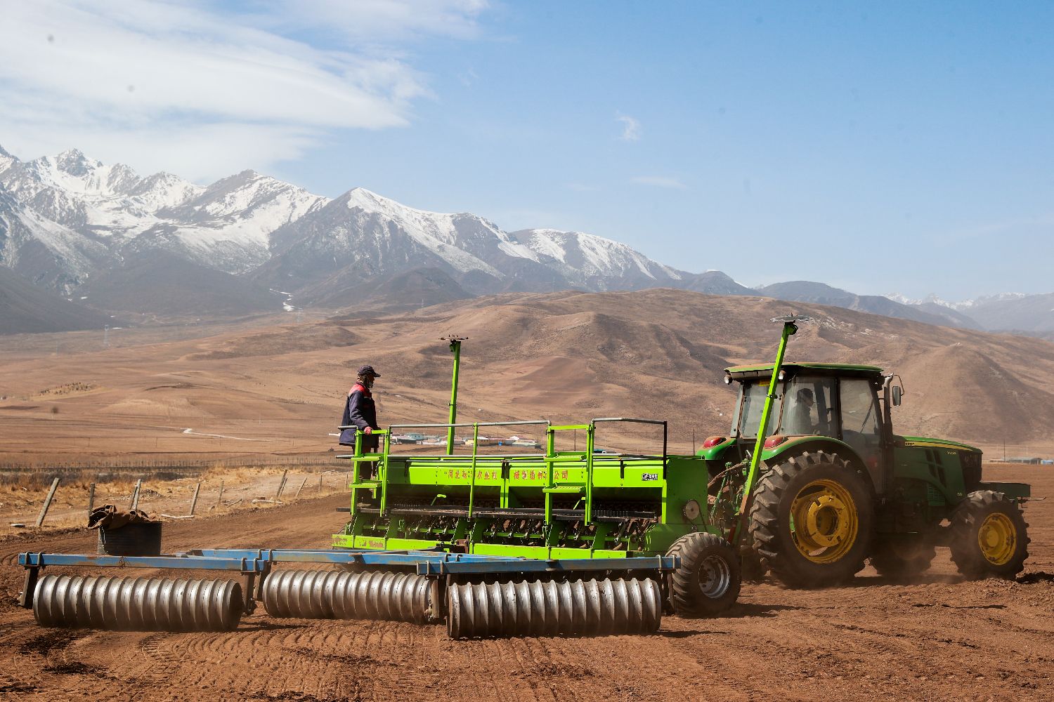 4月8日,青海省海北藏族自治州门源回族自治县农户种植户播种青稞。青稞是青藏高原特有的高原谷类作物,门源县是青海省青稞主产区之一。图为农机播种青稞。中新社