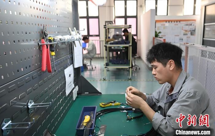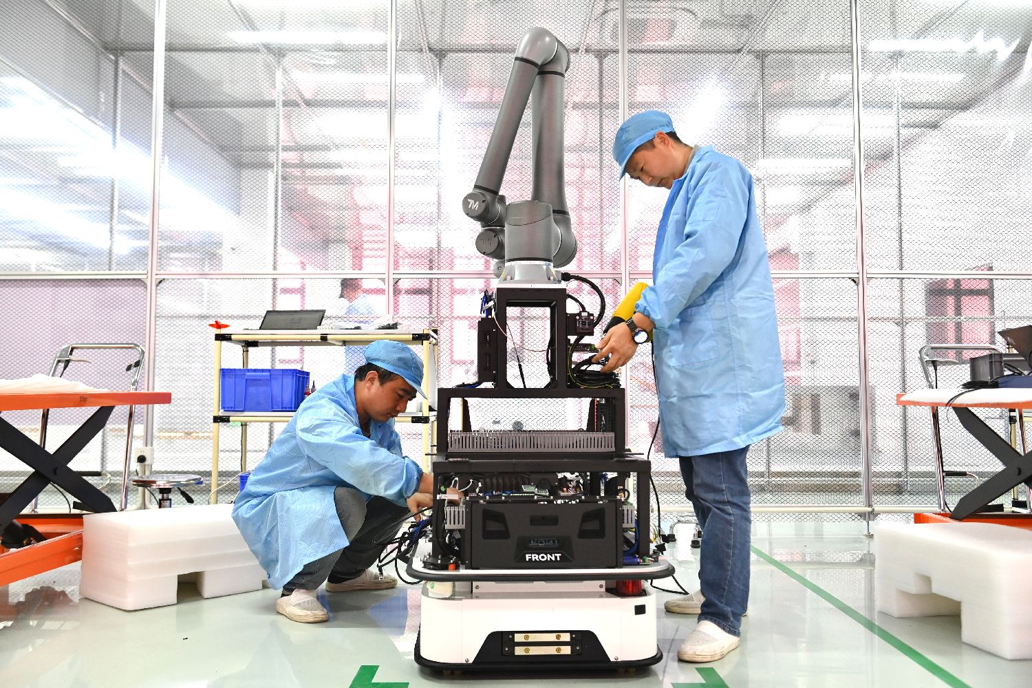 4月8日,技术人员在进行工业机器人的组装与调试。中新社