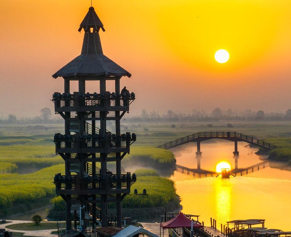最是一年春好处。中国进入春季,繁花似锦,春风和暖,人们踏春赏花乐享春光。图为4月8日,江苏兴化千垛景区日出晨景。
