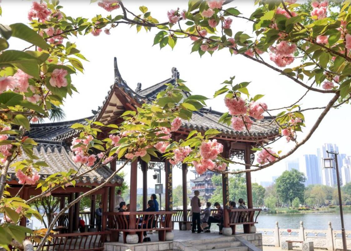 4月8日,游人在湖北武汉一公园赏花游览。