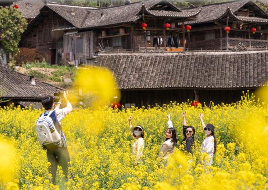 4月8日,游客在湖北宣恩县彭家寨吊脚楼前赏花游玩。