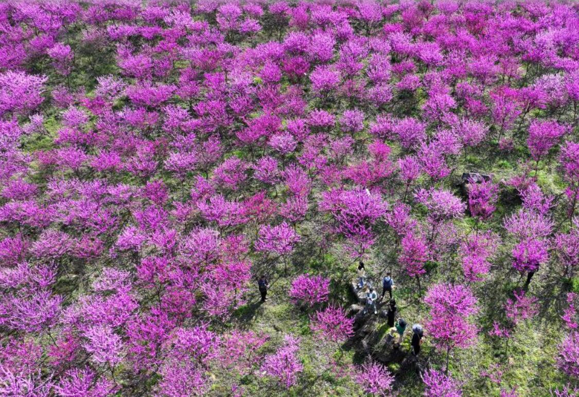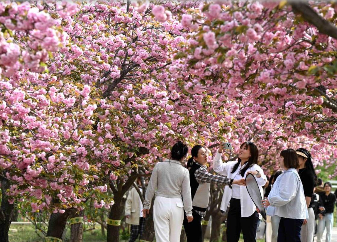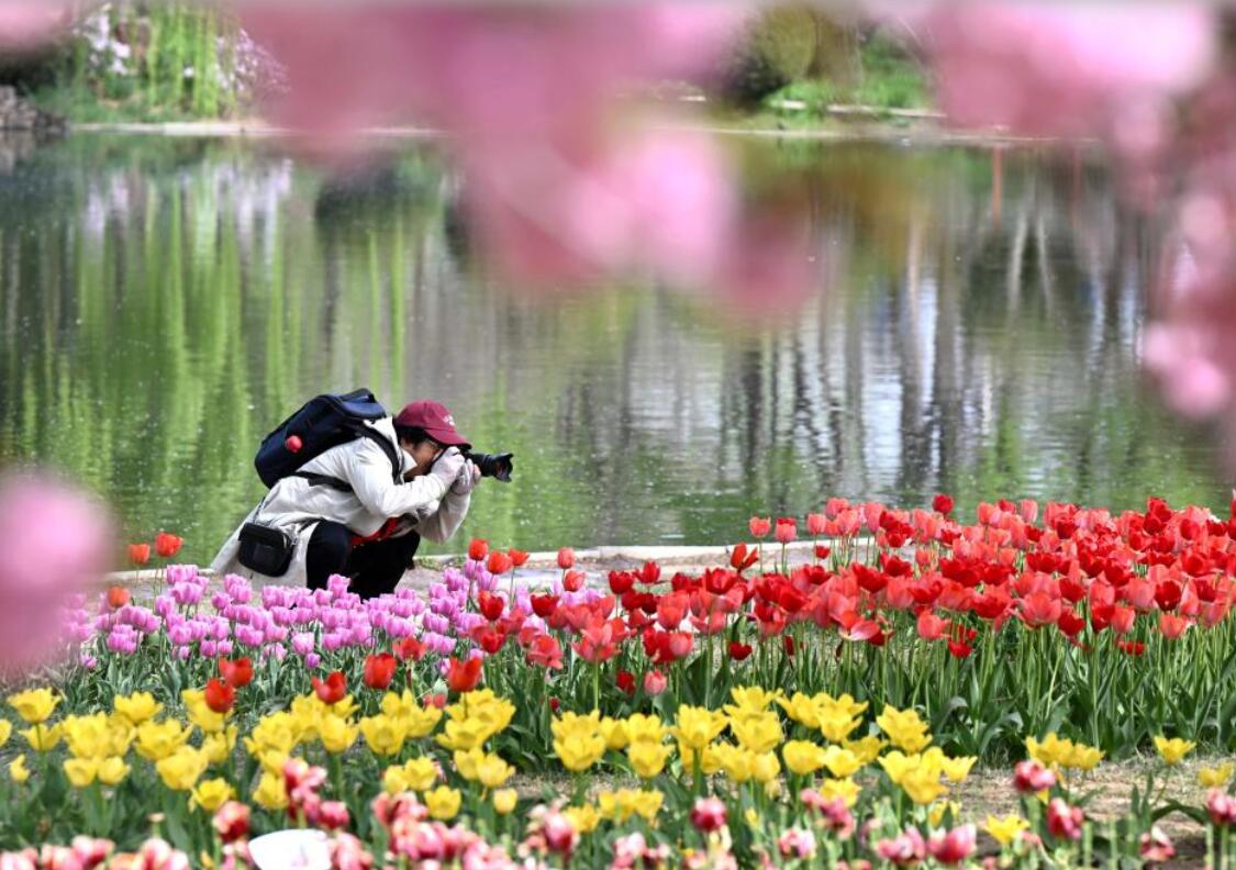 4月8日,游客在河北石家庄植物园赏花游玩。