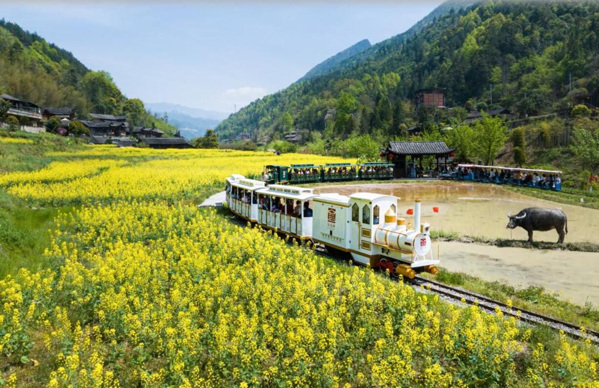 4月8日,游客在湖北宣恩县彭家寨吊脚楼前乘坐“小火车”赏花游玩。