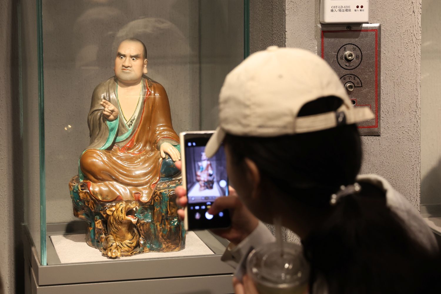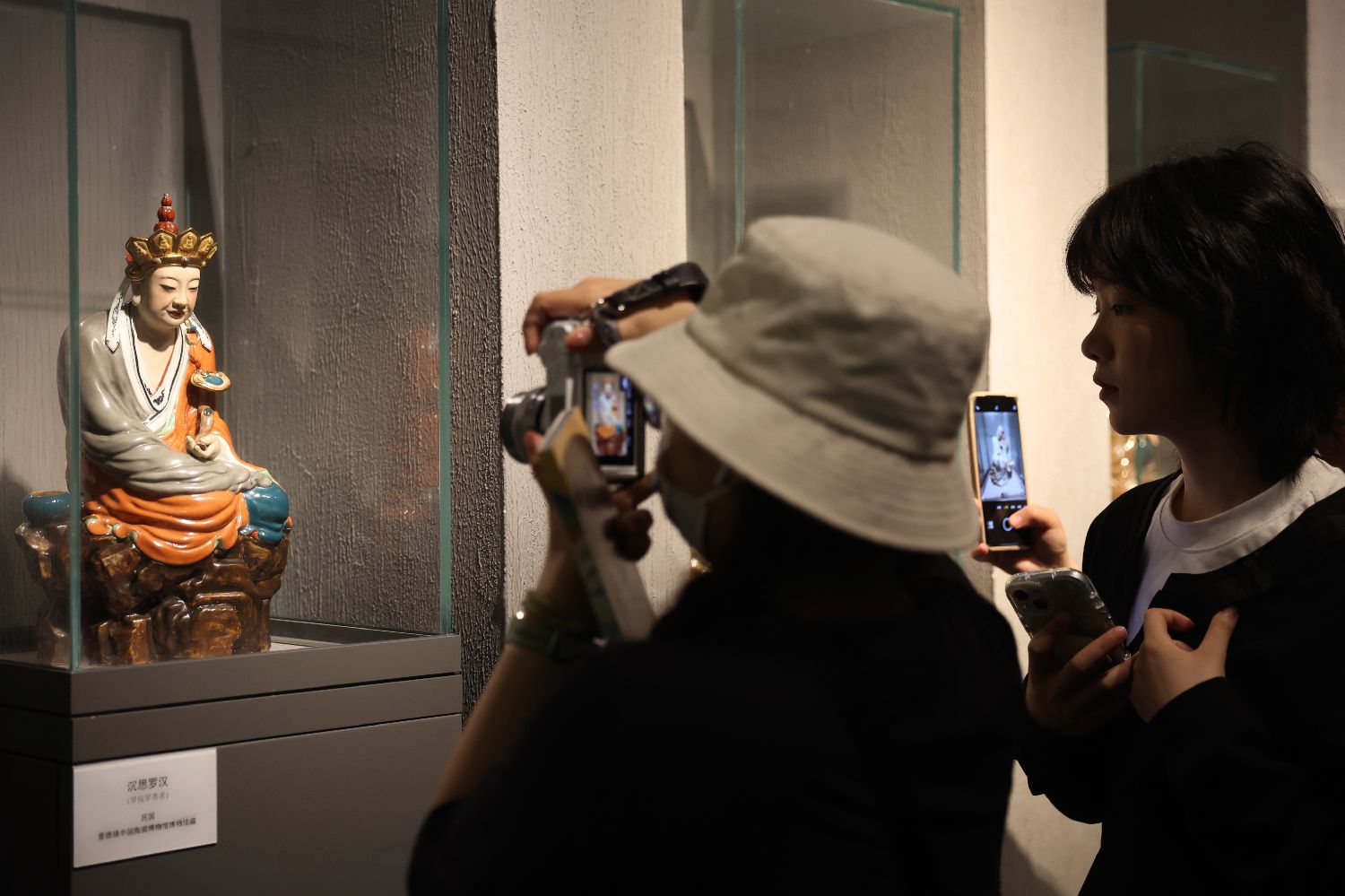游客在博物馆内参观火出圈的“沉思罗汉”(被网友称为“无语菩萨”)陶瓷雕塑。中新社