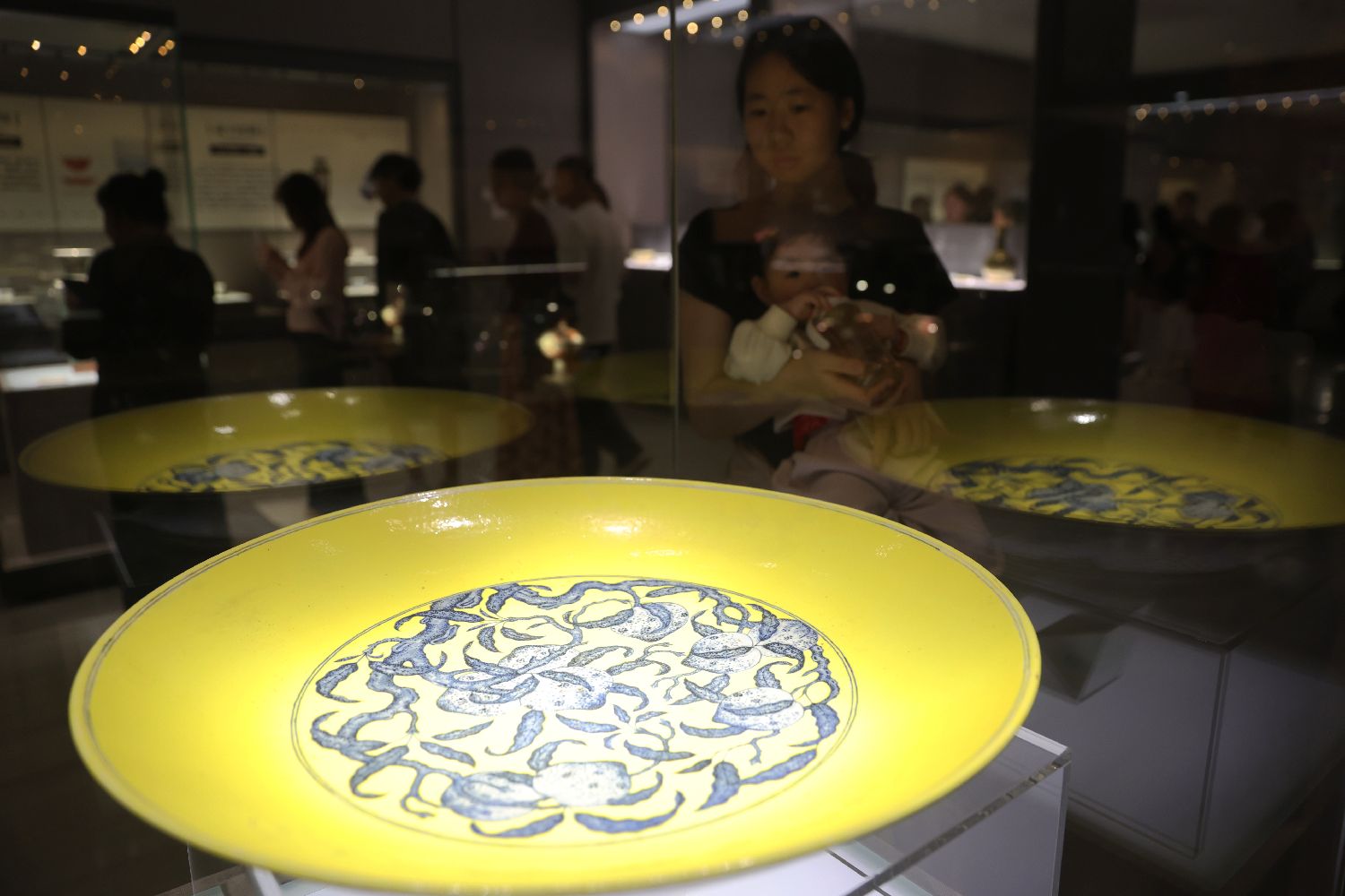 游客在博物馆内参观清代黄地青花九桃纹盘。中新社