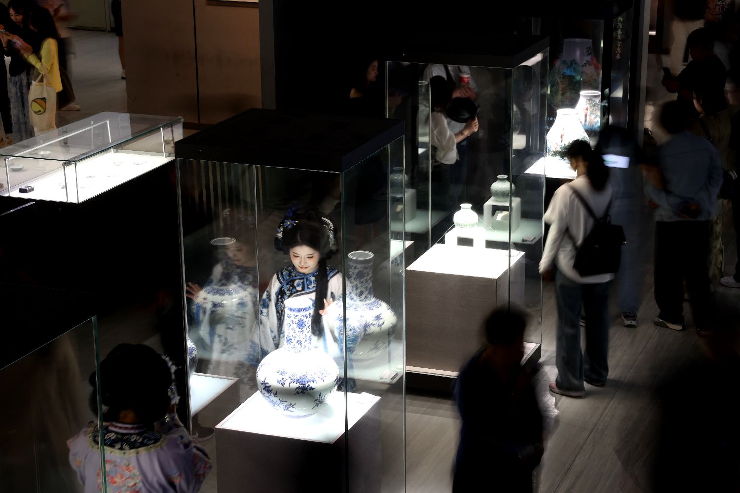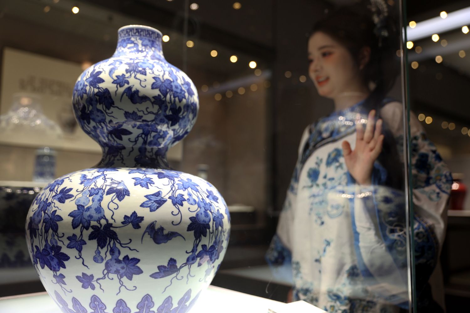 一名身穿青花纹服饰的游客在清代青花福禄纹葫芦瓶旁拍照“打卡”。中新社