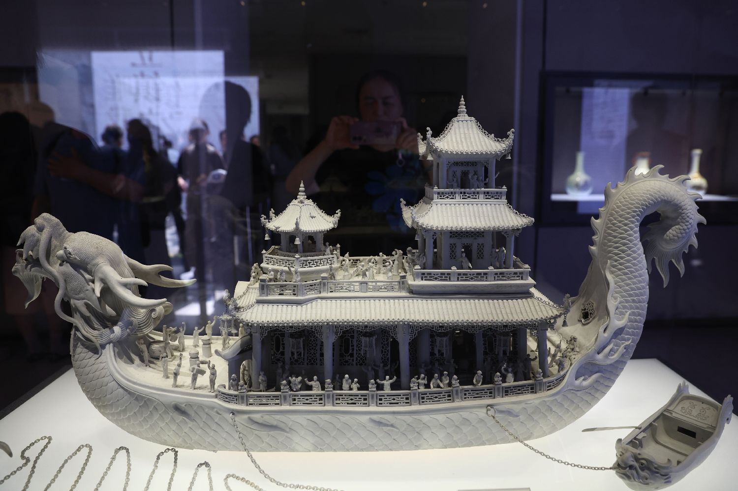 游客在博物馆内参观展出的现代作品“涩胎龙舟瓷雕”。中新社