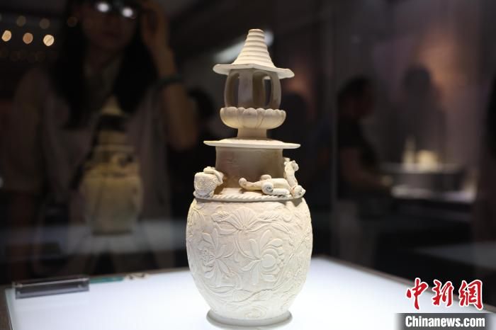 游客在博物馆内参观南宋时期的素胎刻花堆塑四灵盖罐。中新网