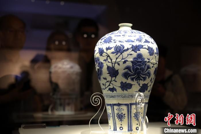 游客在博物馆内参观元代青花缠枝牡丹纹梅瓶。中新网