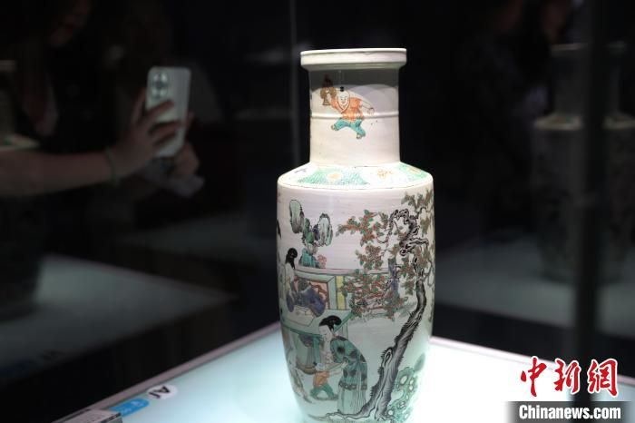 游客在博物馆内参观清代康熙年间的古彩琴棋书画人物图瓶。中新网