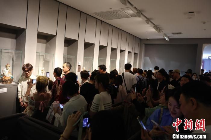 游客在博物馆内排队参观火出圈的“沉思罗汉”和“伏虎罗汉”陶瓷雕塑。中新网