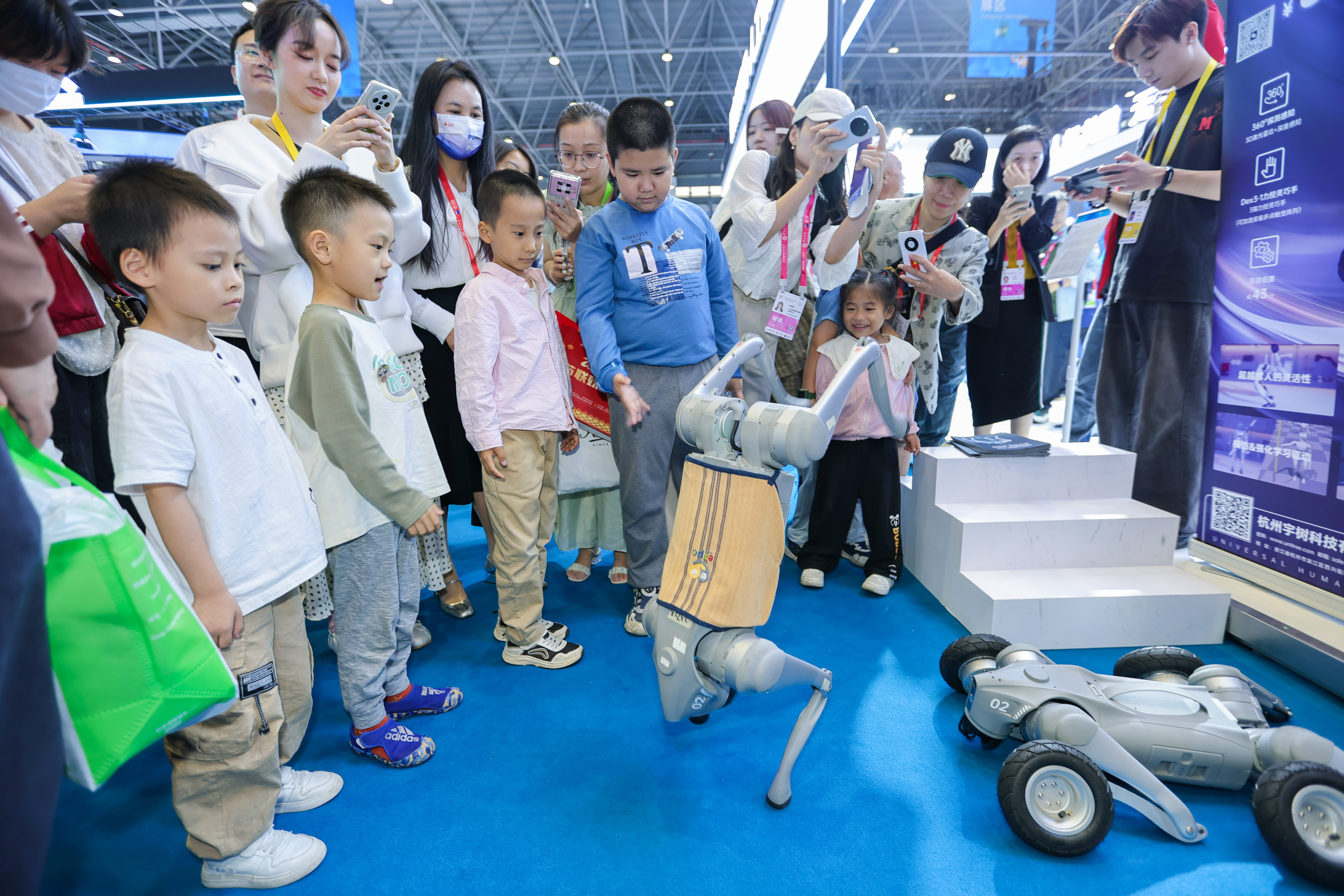 宇树科技展出的智能机器狗表演倒立,吸引参观者。中新社
