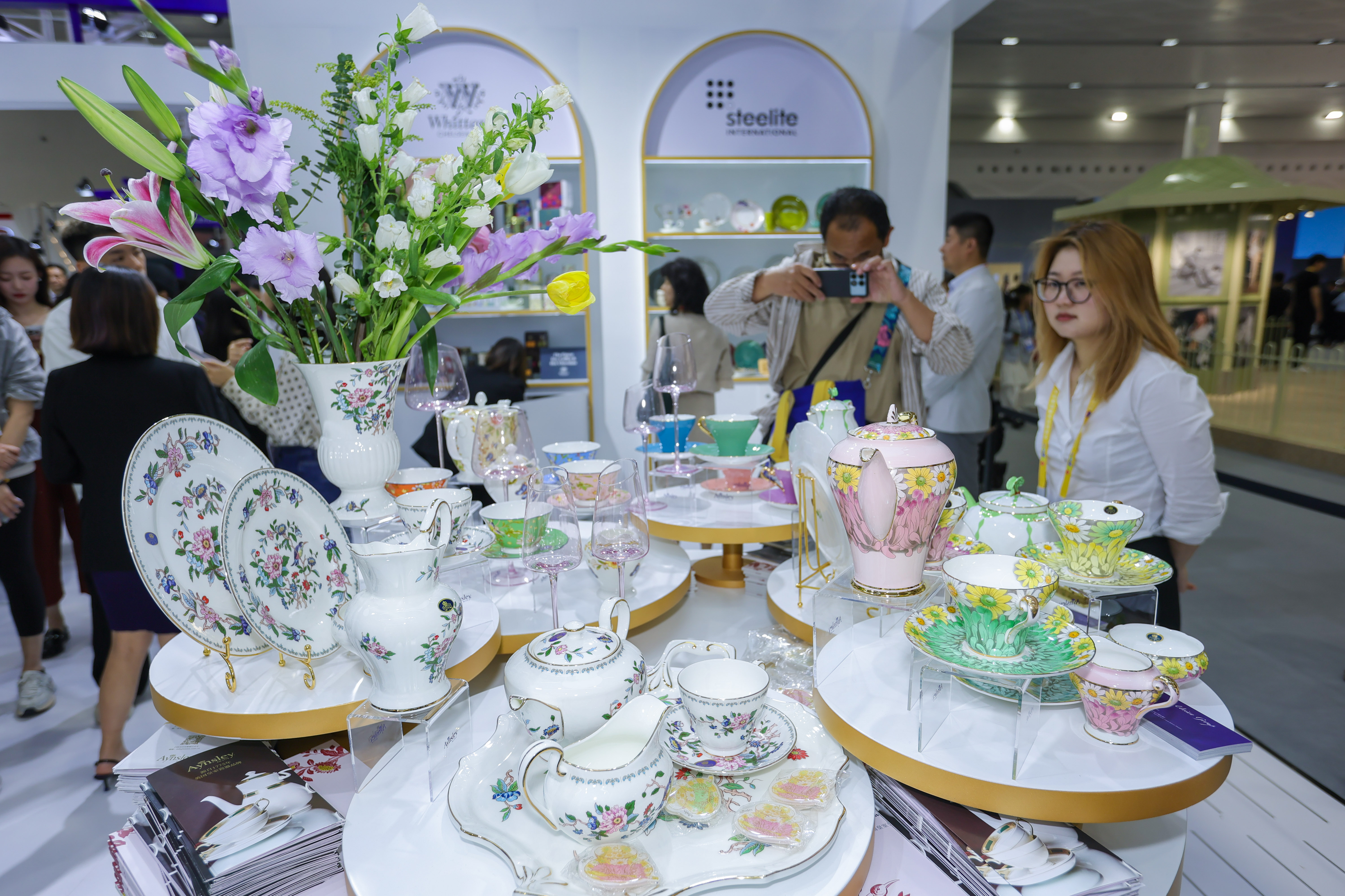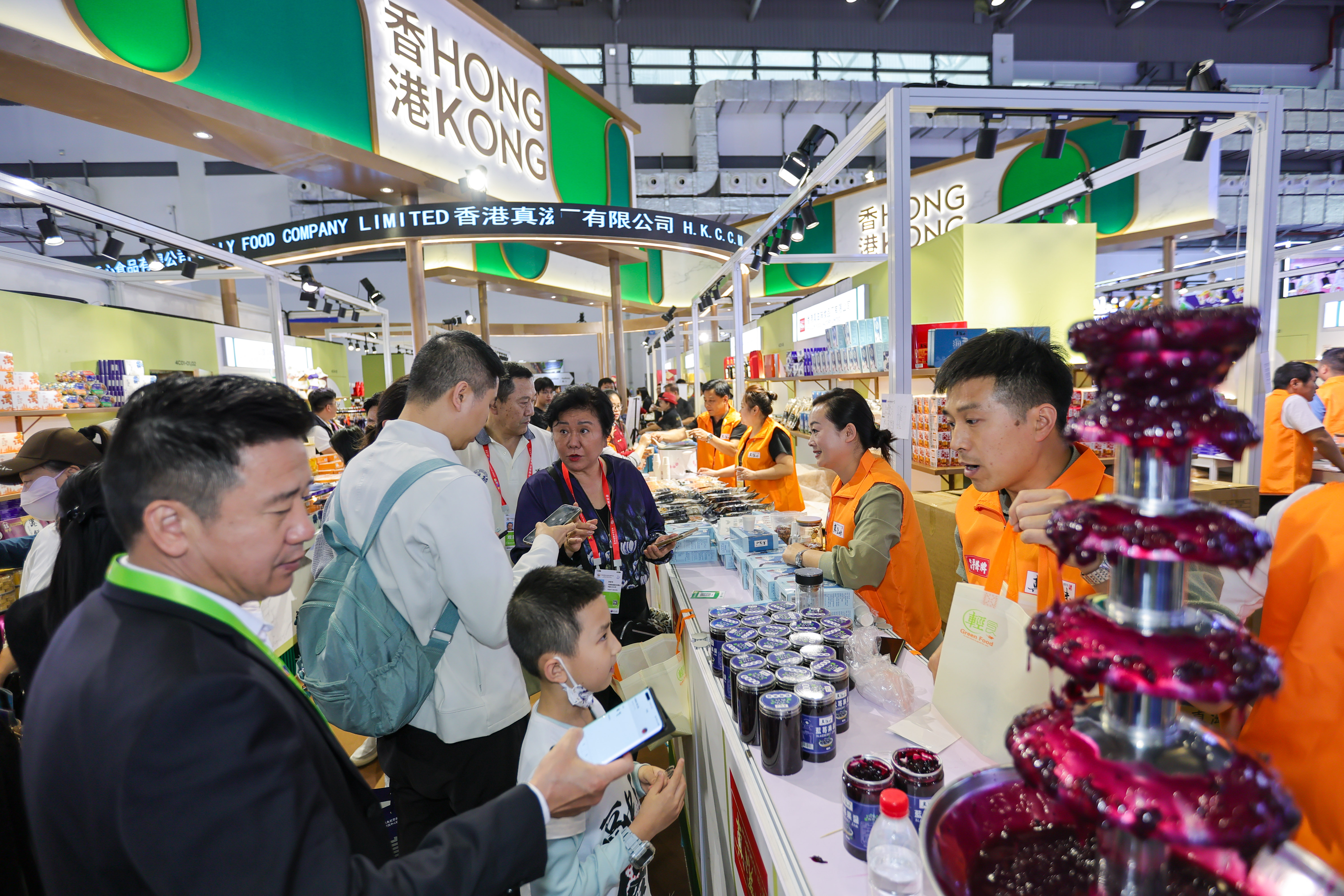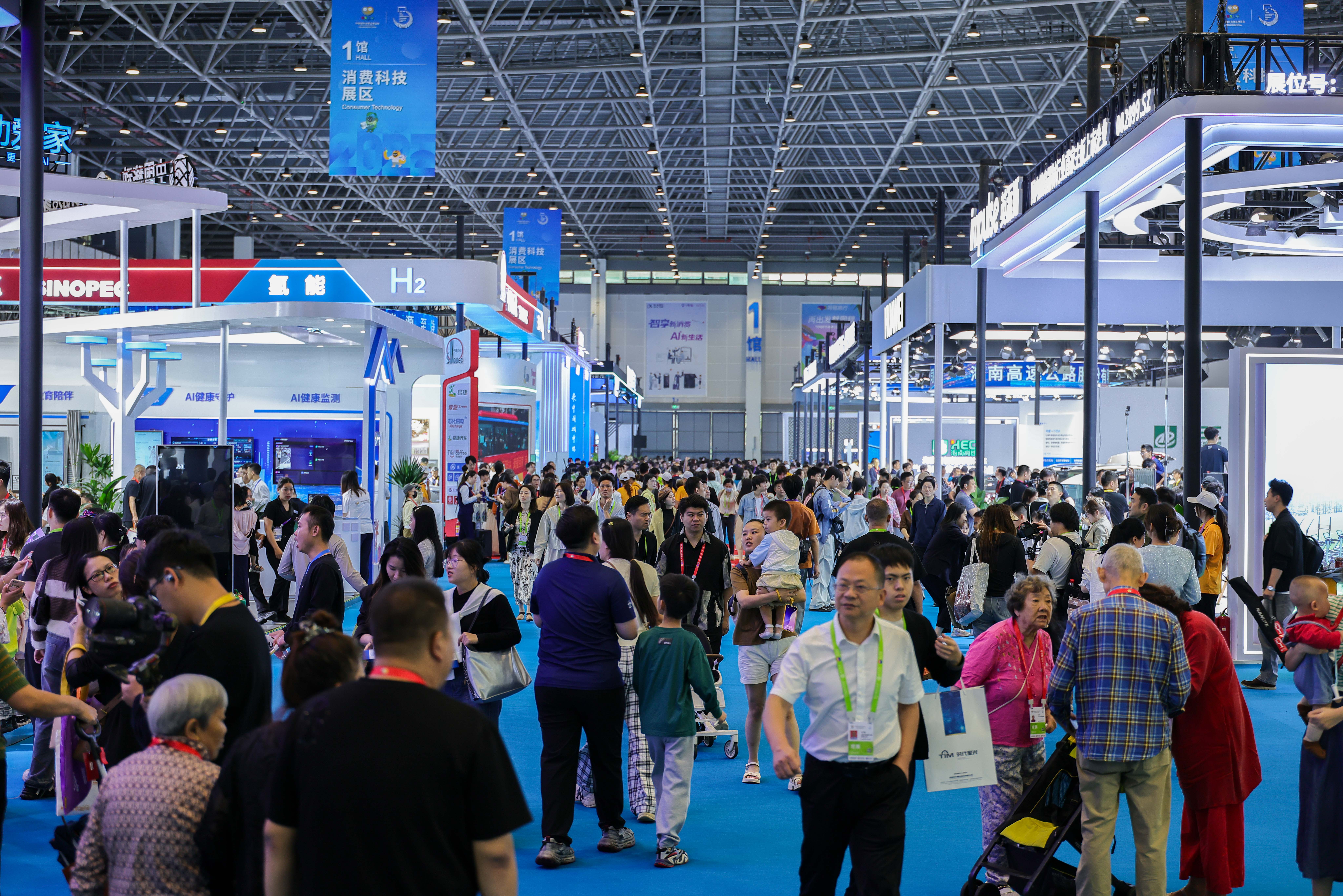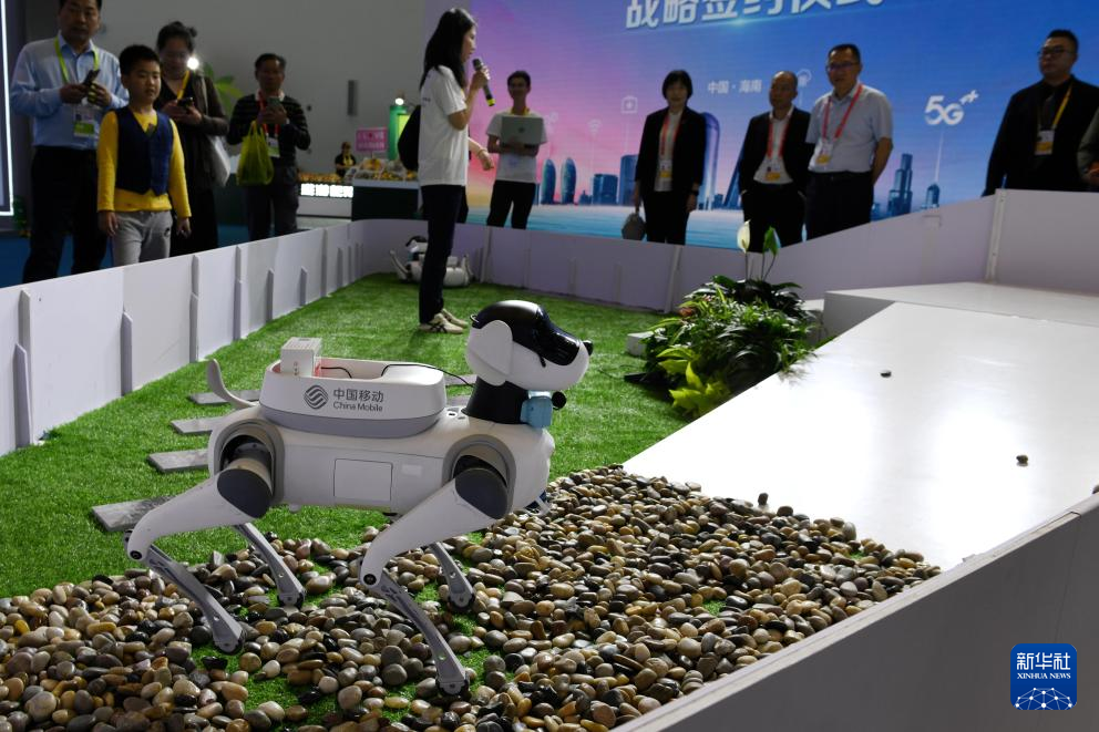 在第五届中国国际消费品博览会中国移动展台,工作人员在演示机器狗模拟给户外活动的老年人送药的场景。新华社