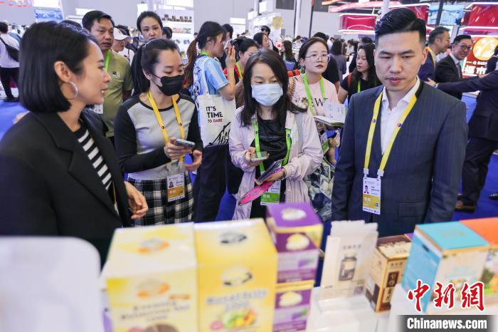 观众在消博会现场观看一款拉花咖啡机器人。新华社