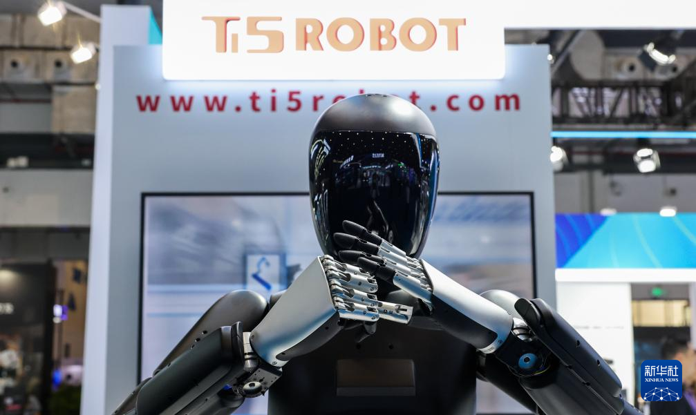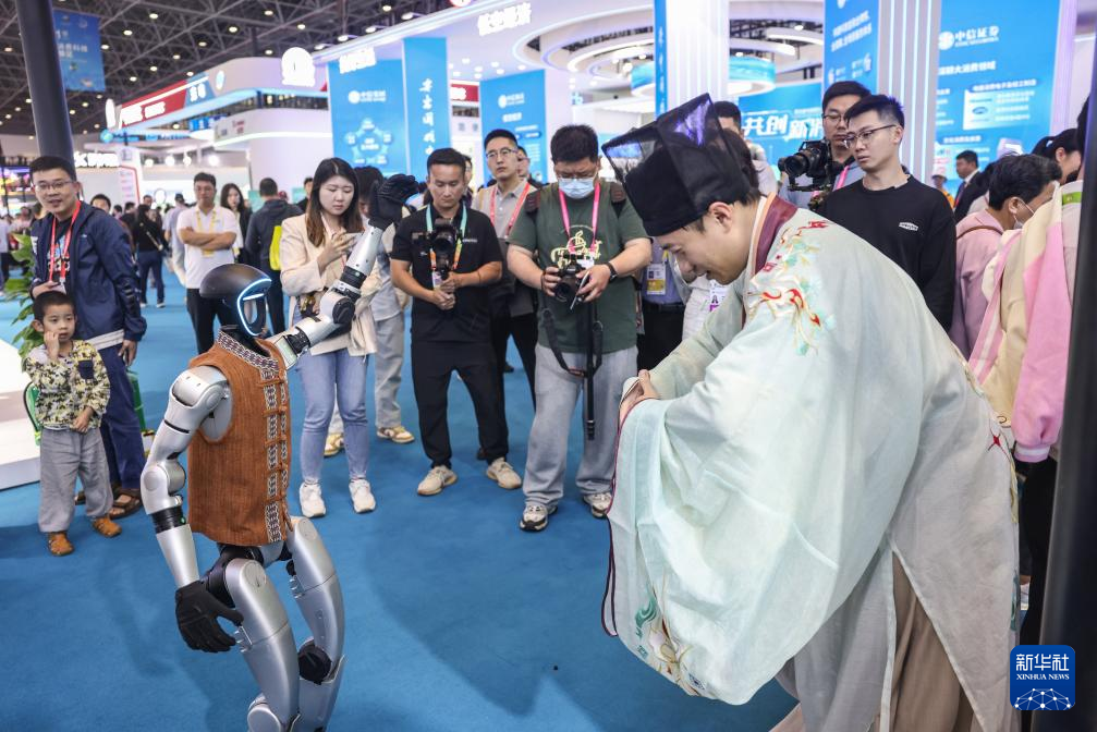 身着古装的观众在第五届消博会上与宇树科技的人形机器人互动。新华社