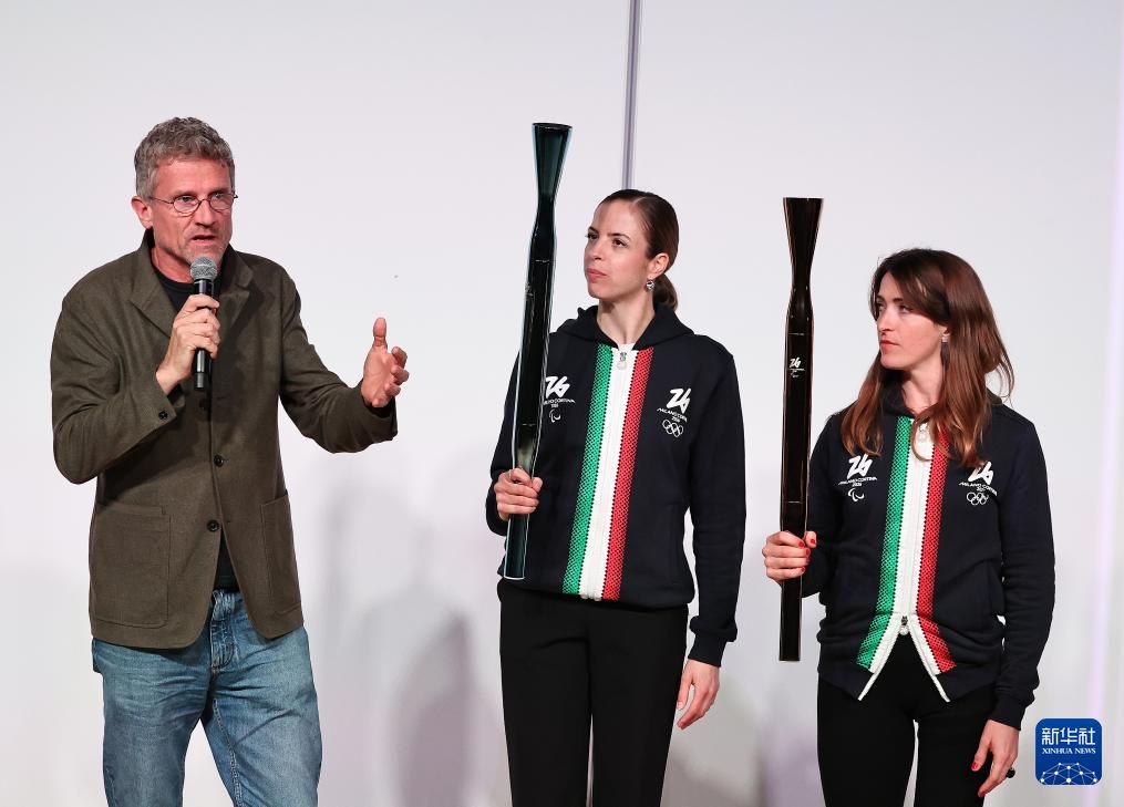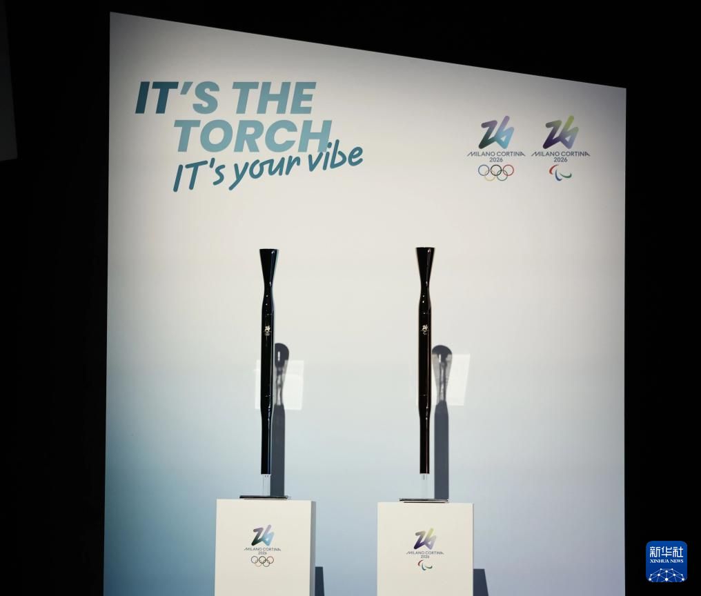 4月14日,2026年米兰-科尔蒂纳丹佩佐冬奥会和冬残奥会火炬在意大利米兰三年展博物馆和日本2025年大阪·关西世博会(下称大阪世博会)的意大利馆同步发布。图为当日在米兰发布活动现场的2026年米兰-科尔蒂纳丹佩佐冬奥会火炬(左)和冬残奥会火炬。新华社