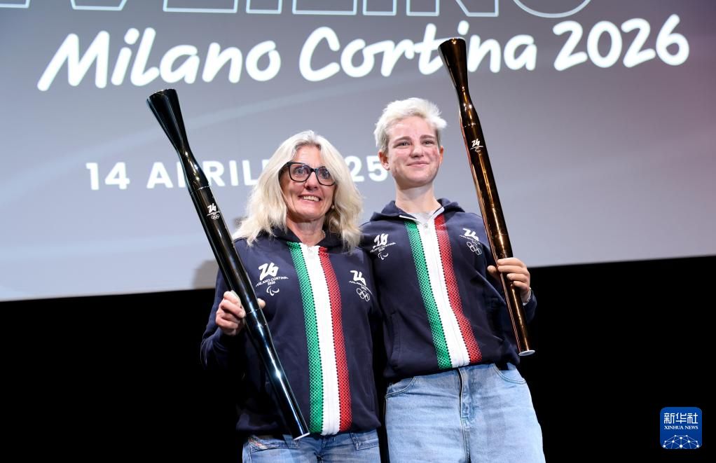 4月14日,冬奥会冠军斯特凡妮娅·贝尔蒙多(左)和残奥会冠军贝贝·维奥在米兰举行的发布活动上展示火炬。新华社
