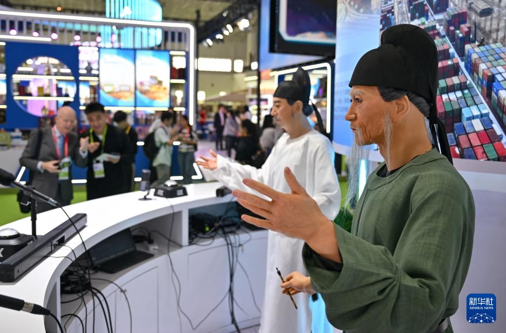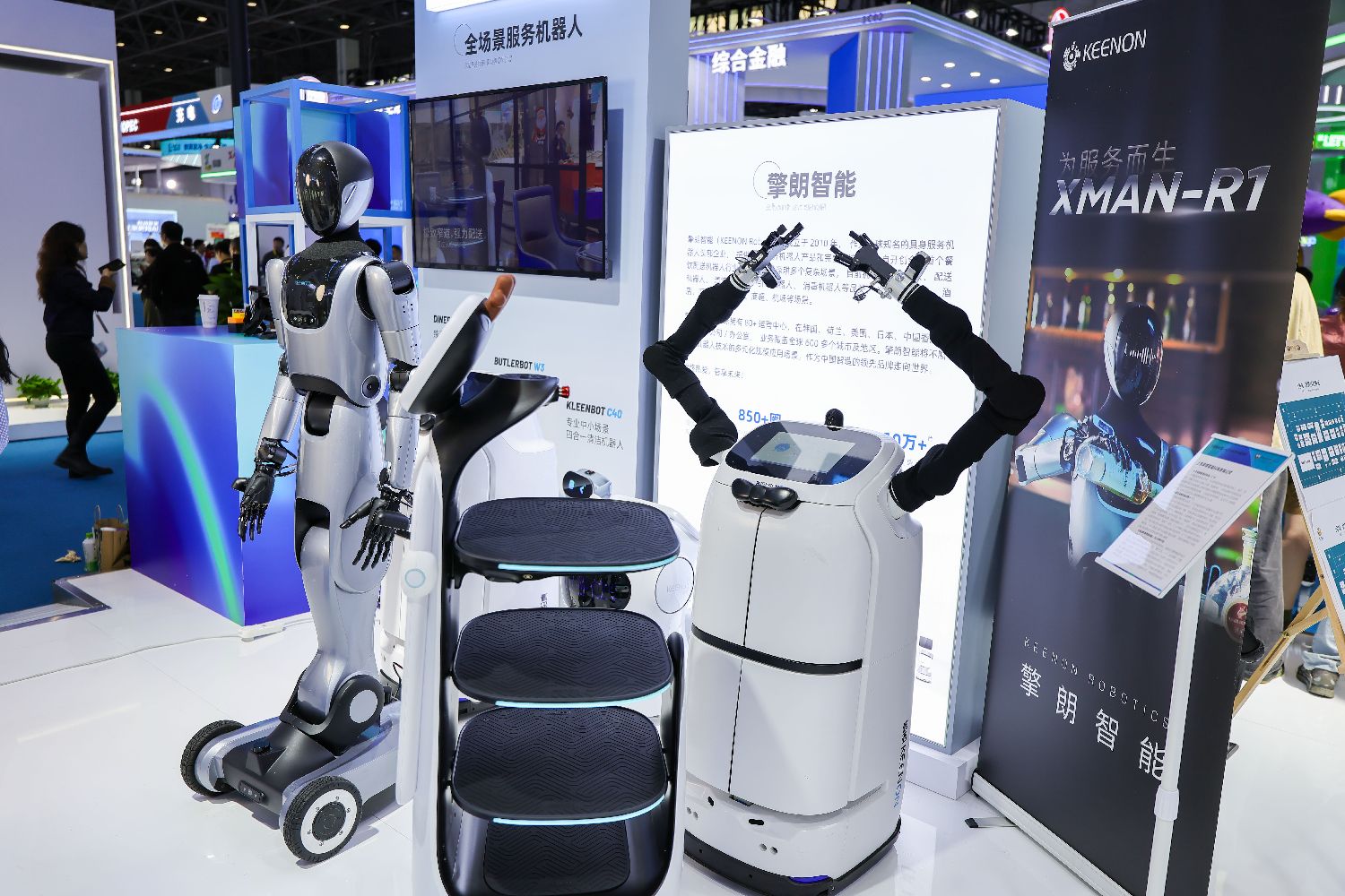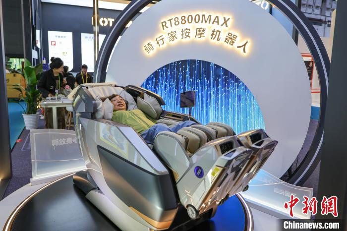 4月14日,多款服务机器人亮相消博会现场。中新社