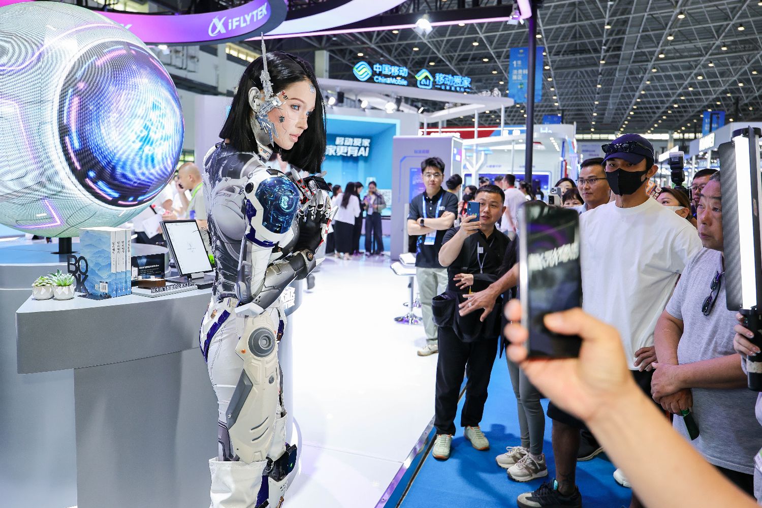 中国移动展出的机器人挥舞双手吸引参观者。中新网