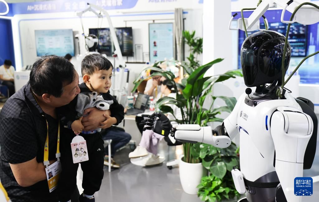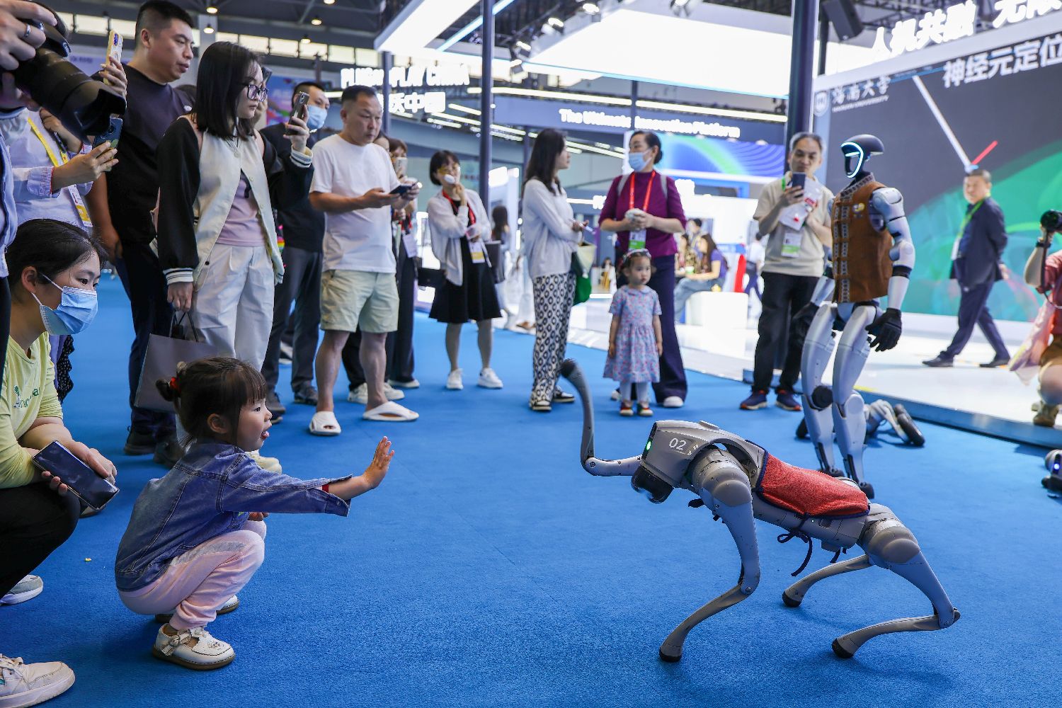 4月14日,宇树科技展出的智能机器狗和一位小朋友互动。中新社