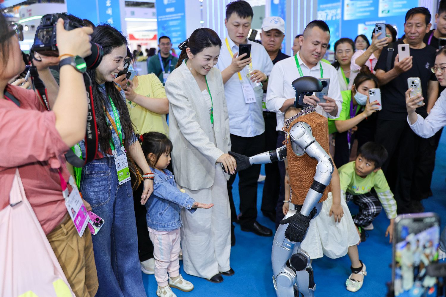 4月14日,一台宇树科技的机器人与现场观众握手互动。中新社